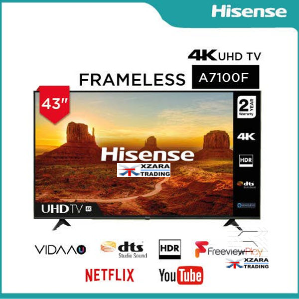 Hisense 43 inch True 4K UHD LED Matrix Frameless VIDAA OS Based Smart TV- Resolution 3840 × 2160, Image Refresh Frequency 60Hz, Contrast Ratio 4000:1, Response Time 8ms Smooth Motion Rate 120,VIDAA OS U3 Interface, Web Browser, Bluetooth Ver 5.0 Connectivity, Built-in Wi-Fi 802.11b/g/n, 2 x USB 2.0 ports, 3 x HDMI ports, 1x Ethernet LAN Port (RJ-45), DVB-T2 Digital RF Input, DLNA Compliant, Optical Digital Audio Output (SPDIF), Dolby Digital, DTS Studio Sound, 2x 7W Audio Power Output, Screen Mirroring (Anyview Cast), Retail Box, Retail Box , 3 Year Limited Warranty